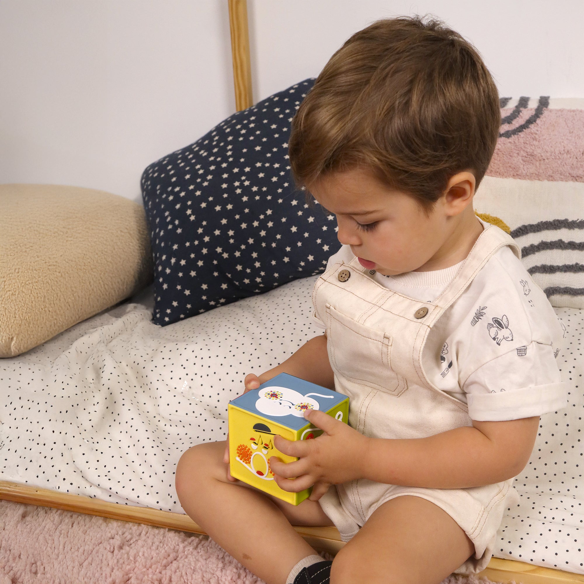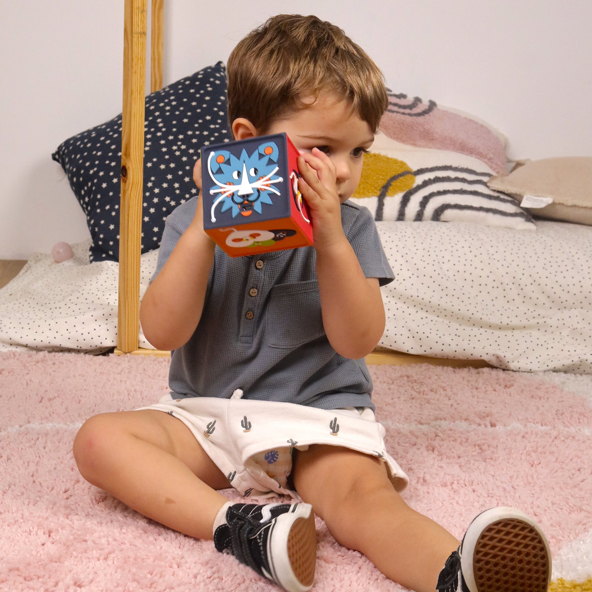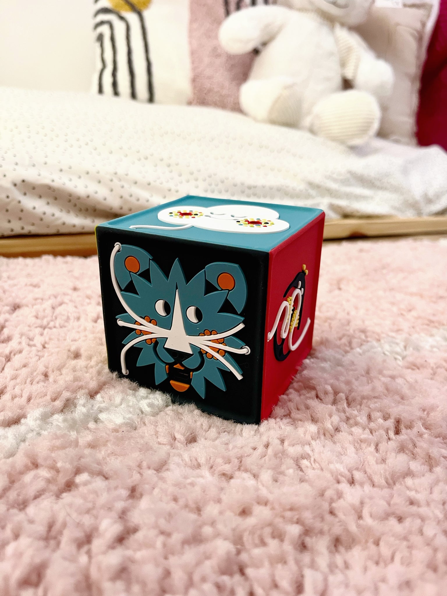 Sensorielle et intuitive, la conteuse n’a pas de bouton. Secouez-là 3 fois pour l’allumer, magique ! Bébé écoute, touche, regarde et babille avec la conteuse.
